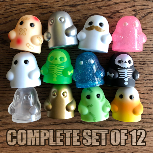 This listing includes the complete set of 12 Tiny Ghost Series One designs: OG White, Frost, Skelleton, Frankenghost, Candy Corn, Invisible, Silver, Road Rash, Gold, Dapper, Toxic Skelleton, and Bubblegum.